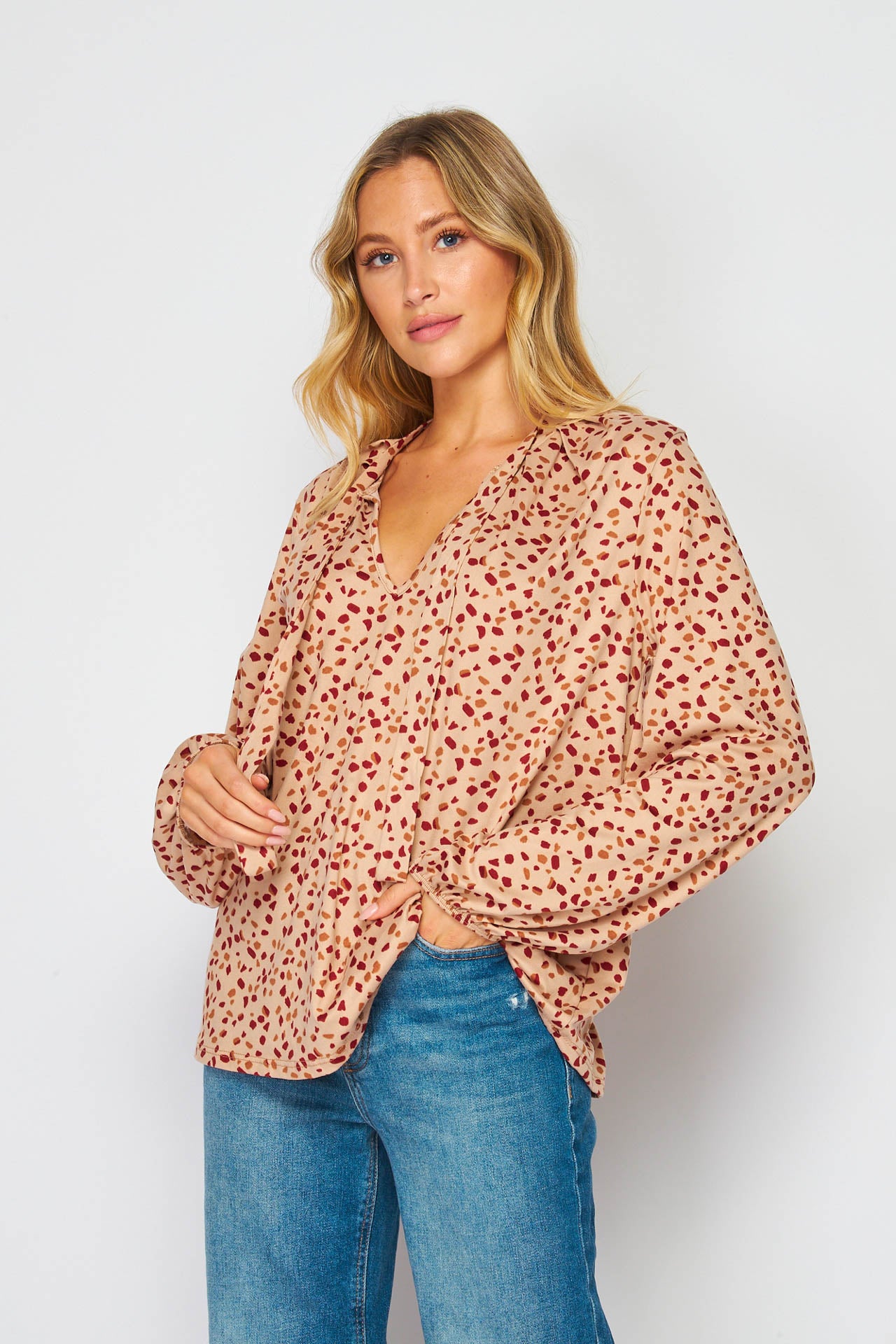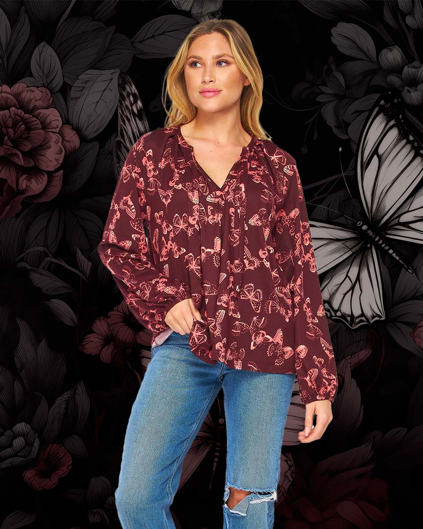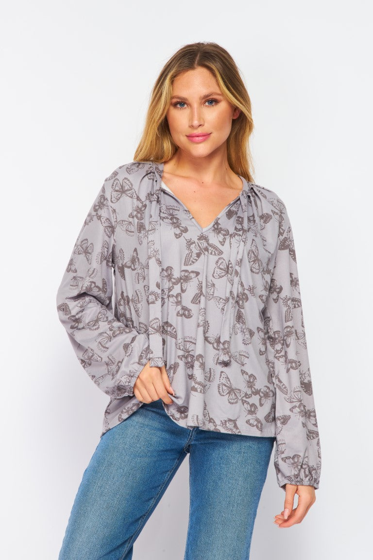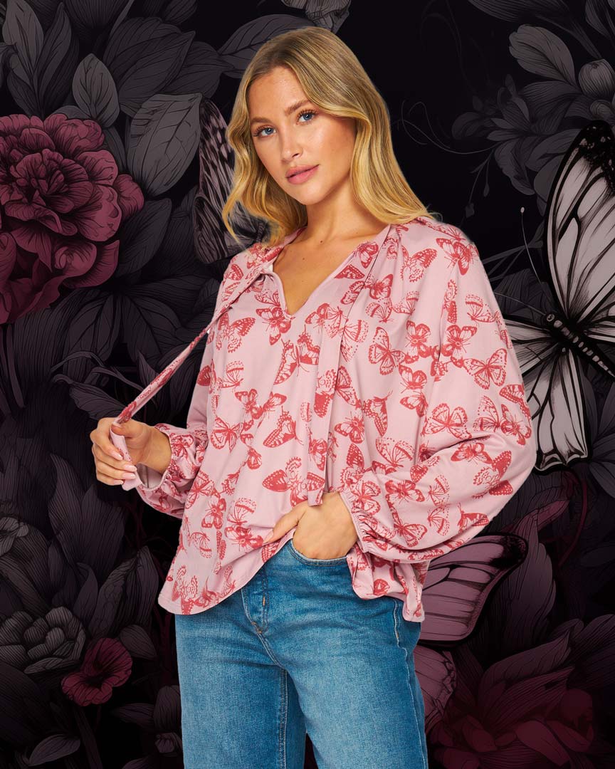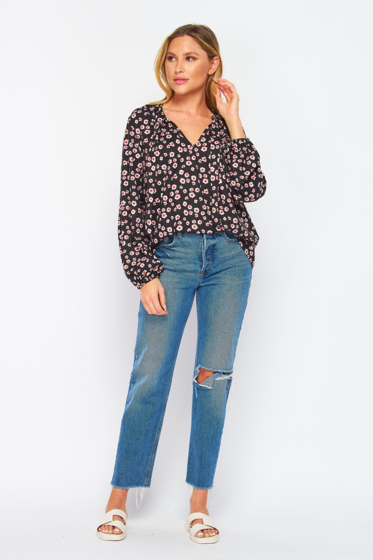 Flowy split-neck tops fashioned with front ties and balloon sleeves for true boho-chic style.