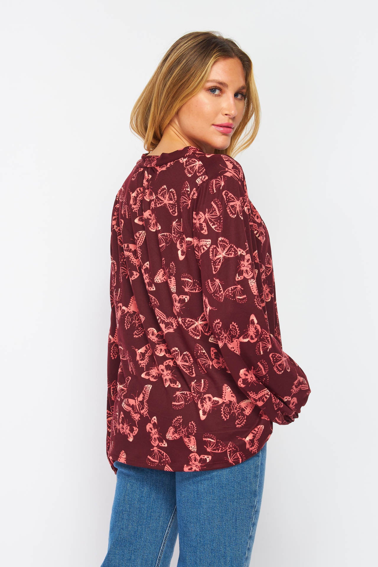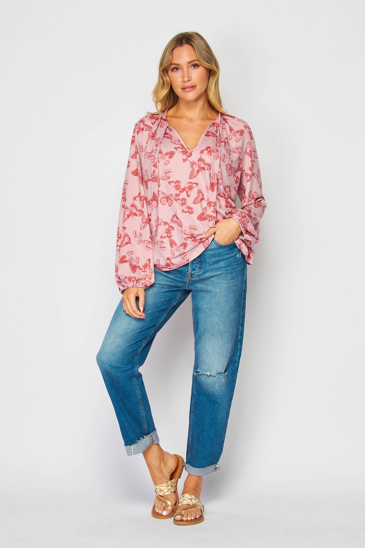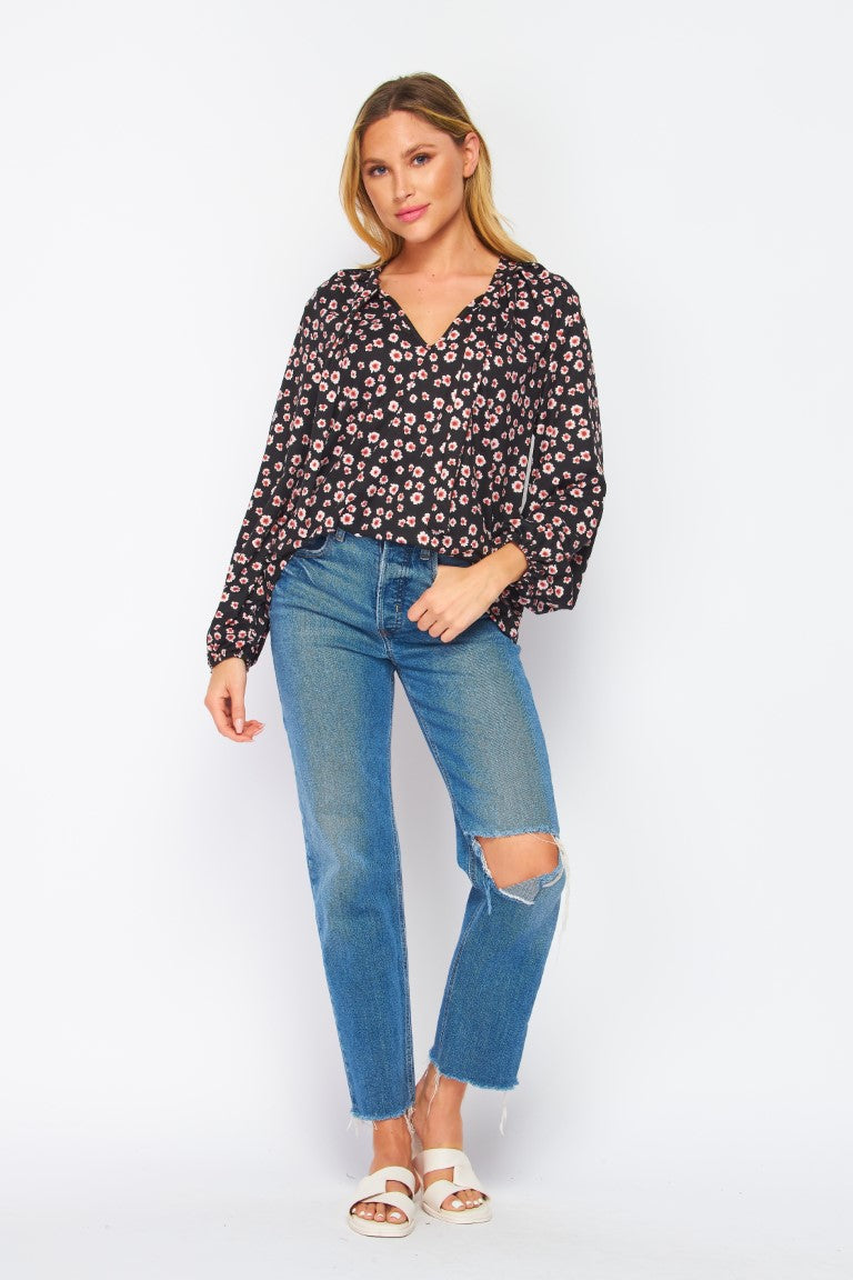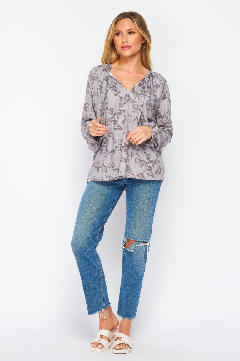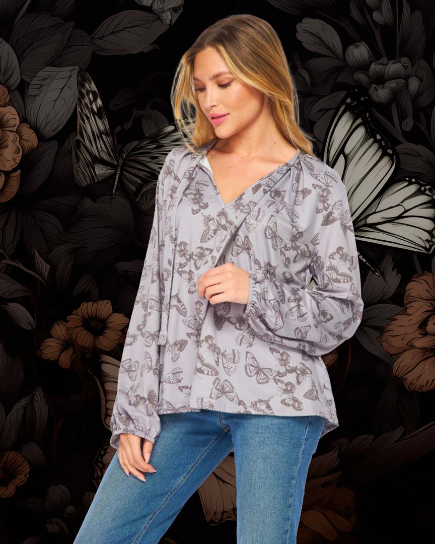 Flowy split-neck tops fashioned with front ties and balloon sleeves for true boho-chic style.