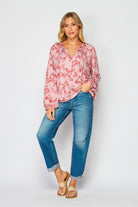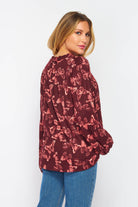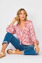Catch the breeze in this flowy split-neck top fashioned with front ties and balloon sleeves for boho-chic style.