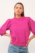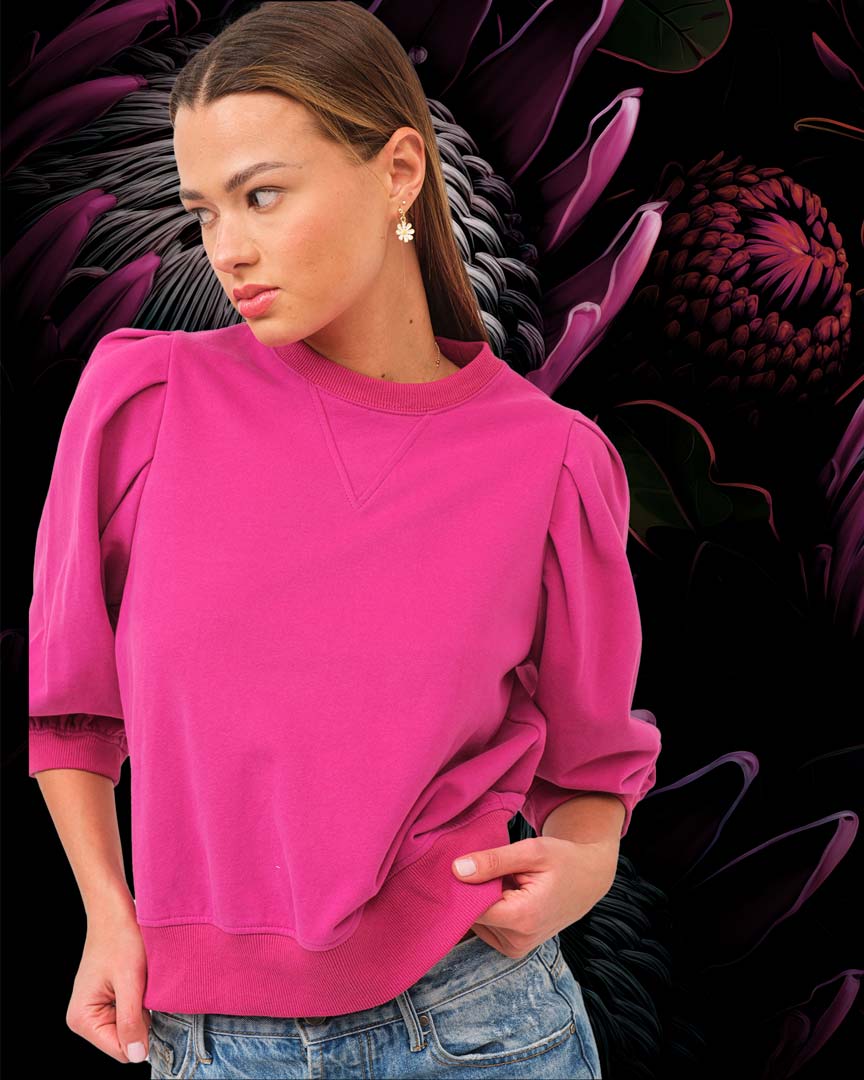 A touch of pop and puff delight the senses in this flirty sweatshirt top